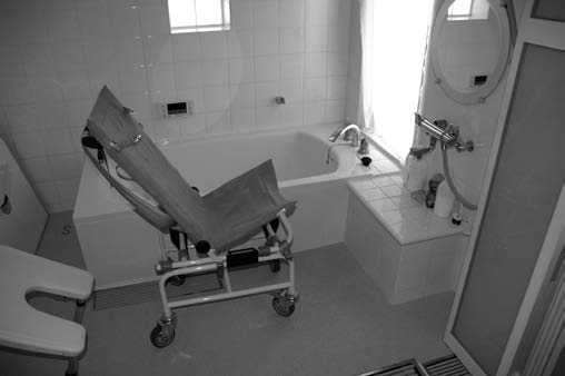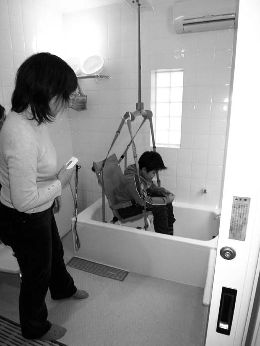 | 天井走行リフトを採用。折りたたみベンチの上で着衣を脱がせ、シャワーキャリーに座らせます。